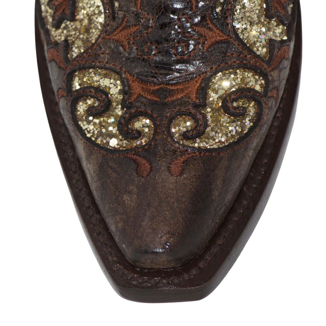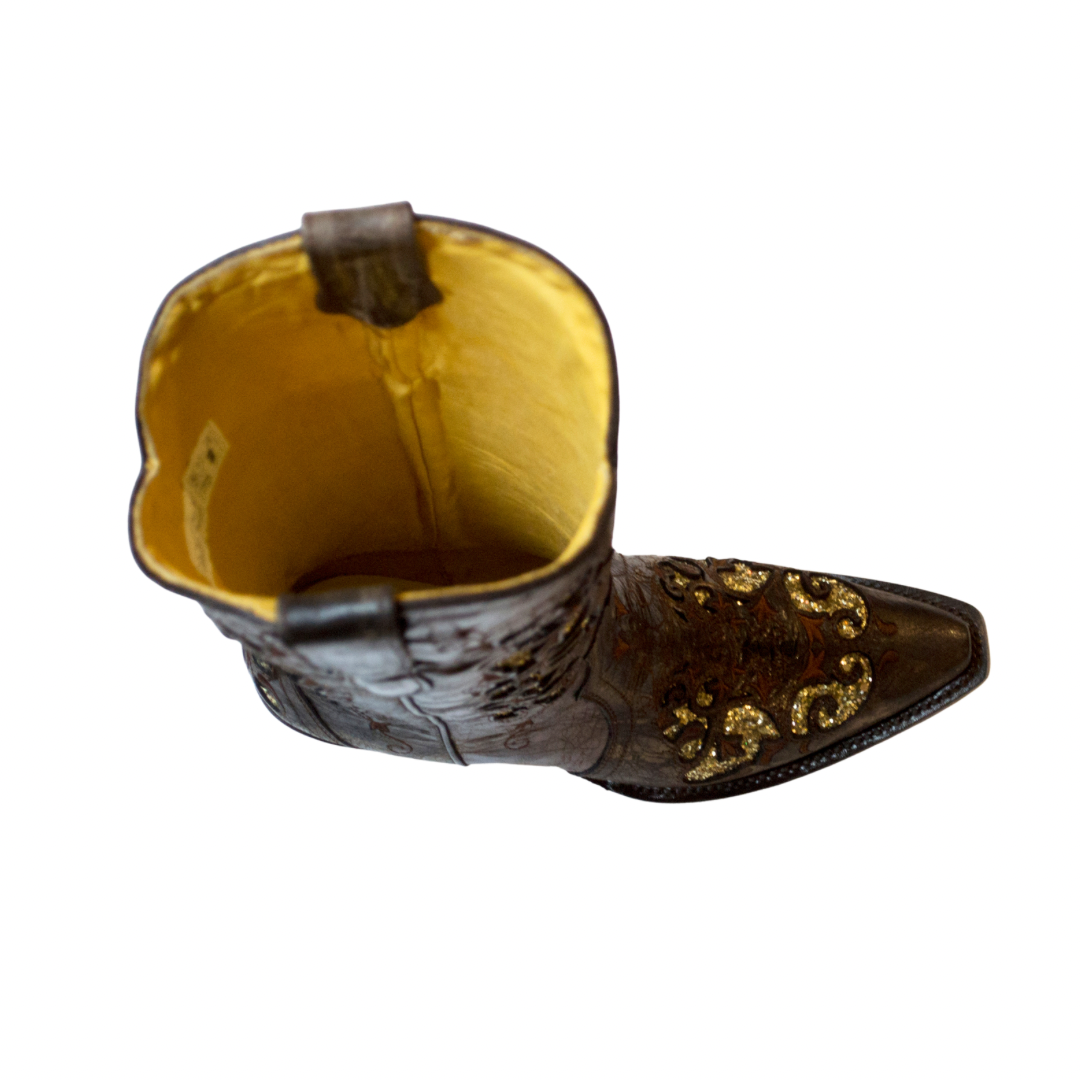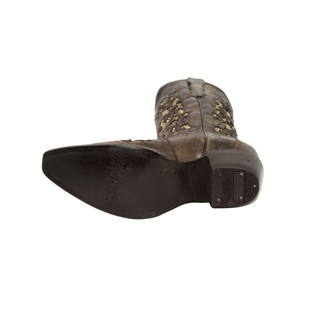 Discover unparalleled elegance with these pointed-toe cowboy boots in rich brown cracked leather. The mid-height shaft features exquisite laser-cut floral patterns accented with delicate gold detailing, creating a sophisticated and timeless design. Built with a durable leather sole, these boots offer exceptional comfort and lasting quality. Perfectly blending classic style with contemporary fashion, this pair is a statement of luxury and effortless sophistication.
